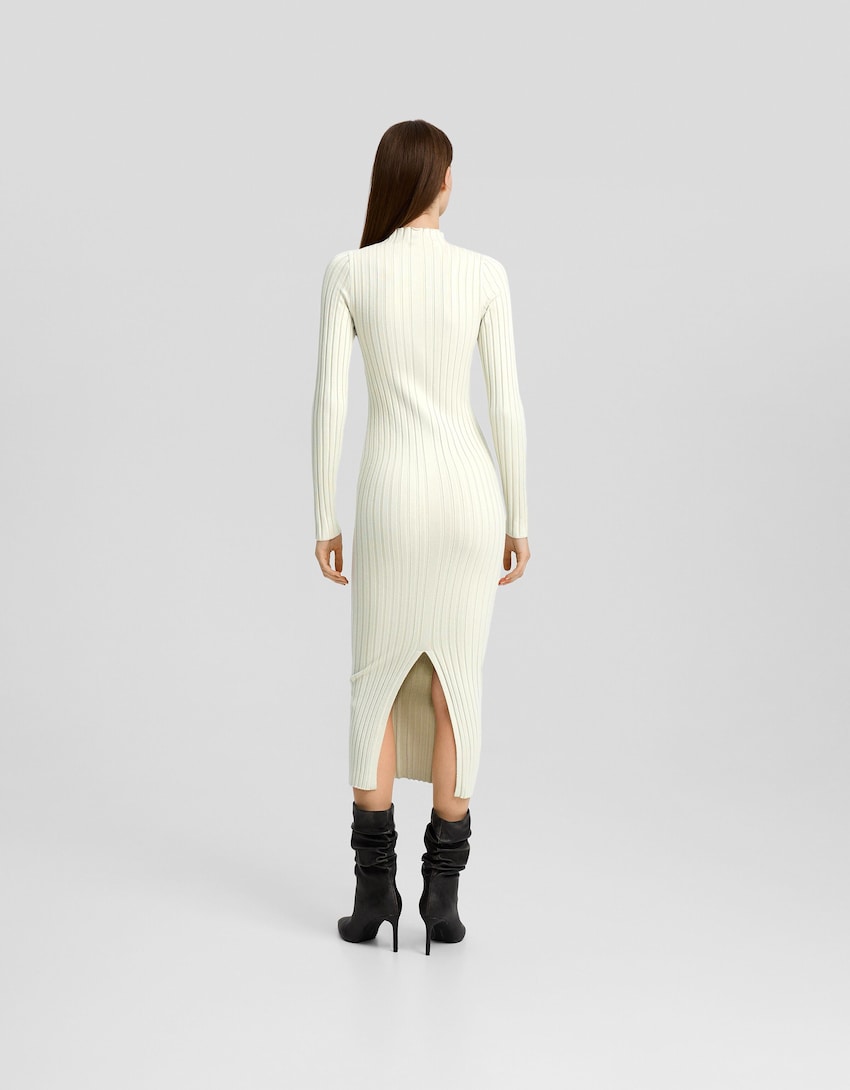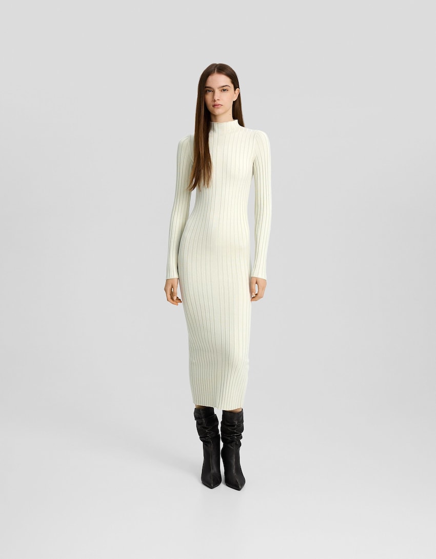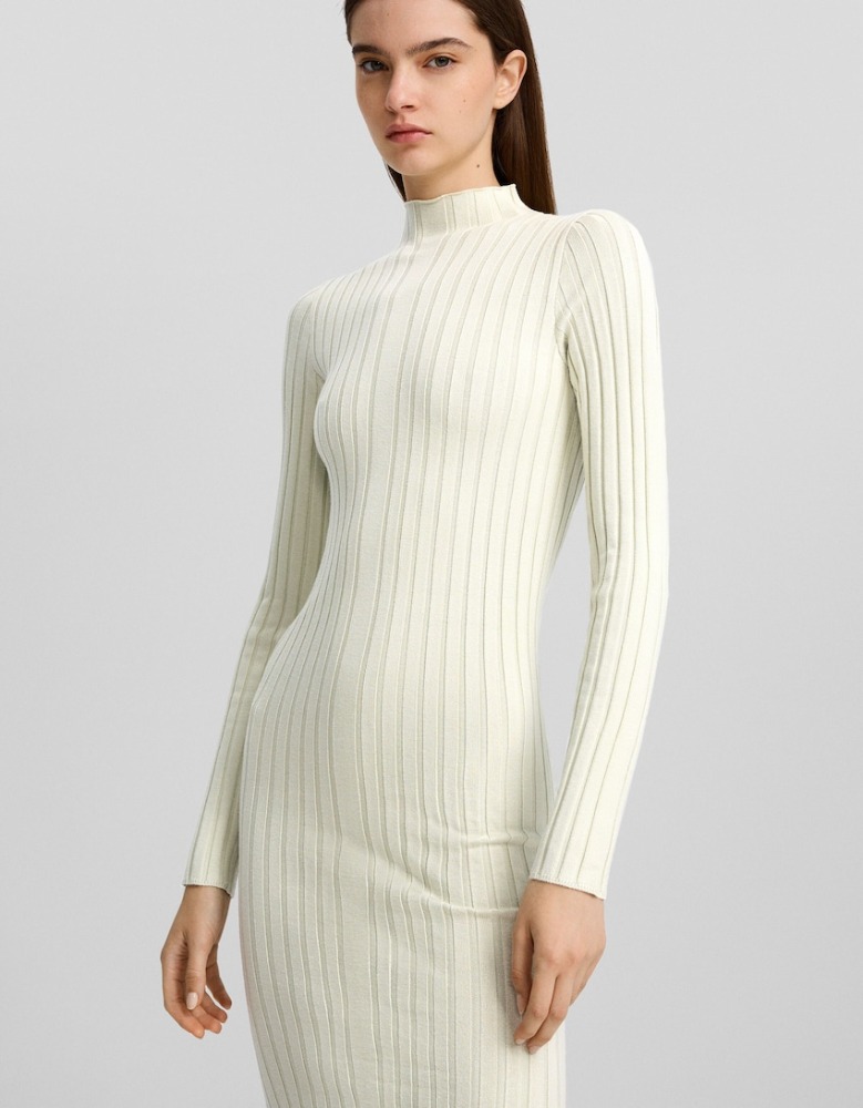 Vestido midi punto rib cuello alto — Bershka. Color: beige. Talla: 24. Material: algodón. Categoría: Ropa Mujer. Descripción: Vestido midi de punto canalé que define la silueta con elegancia. Su cuello alto y tejido rib aportan estructura y calidez sin renunciar al confort. Diseño minimalista y versátil: ceñido en el torso y con caída midi que estiliza la figura. Por qué elegirlo: - Acabado en algodón que garantiza comodidad y transpirabilidad. - Corte favorecedor que realza la silueta. - Color beige neutro ideal para combinar y llevar todo el año. Cómo llevarlo: Combínalo con botas altas para un look urbano y sofisticado o con zapatillas para un resultado casual y moderno. Añade una chaqueta oversized para contraste de volúmenes. Cuidado: Lavar con programa suave y temperaturas moderadas. Planchar a baja temperatura si es necesario.